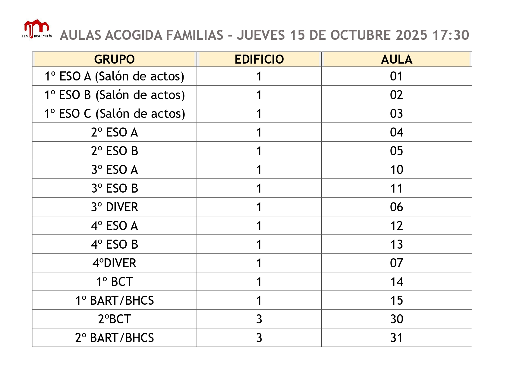Será el jueves 16 de octubre a las 17.30. Todos los padres/madres tienen que dirigirse a las aulas indicadas en las fotos, menos 1º ESO, que serán recibidos/as en el Salón de actos.